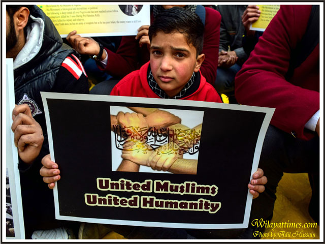A Young boy holds the placard on which slogans in support of Unity written during a demonstration in Srinagar Kashmir.