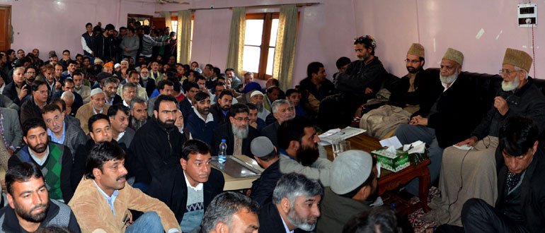 سرینگر:/جملہ مزاحمتی قیادت سید علی شاہ گیلانی، میرواعظ محمد عمر فاروق اور محمد یاسین کی جانب سے بلائے گئے جملہ متعلقین(Stake holders) کا ایک نمایندہ اجلاس حیدر پورہ سرینگر(ہندوستان زیر انتظام کشمیر) میں منعقد ہوا جس میں جموں کشمیر بھر سے آئے ہوئے مختلف سیاسی، سماجی، دینی،تجارتی ،تعلیمی،ٹرانسپورٹ انجمنوں اور تنظیموں کے نمائندگان نے بھر پور شرکت کی۔