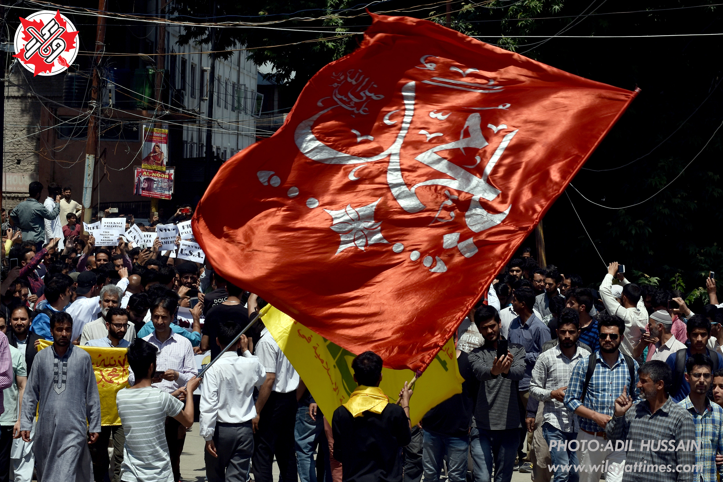 Last Friday of Ramadhan is also observed as Youm al-Quds (Al-Quds Day) across globe to express support and solidarity with the oppressed Muslims of Palestine. Protectors carrying the flag on which name of the Holy Prophet (Pbuh) has been written during Alquds rally at Srinagar Kashmir.