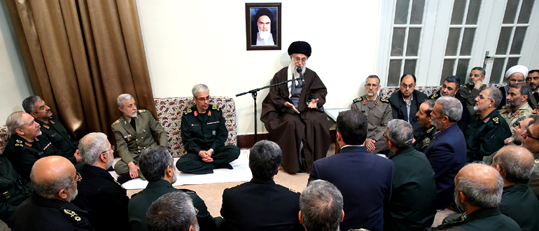 Before the Leader’s remarks, Chief of Staff of the Iranian Armed Forces Major General Mohammad Baqeri submitted a report on the activities of the Iranian Armed Forces. He said increasing the strategic depth of the Islamic Revolution, promoting support for the resistance front and conducting a serious fight against Takfiri terrorists and their supporters, creation and promotion of sustainable security, safeguarding the territorial waters and interests of the Islamic Republic of Iran, bolstering defensive and offensive capabilities and preparedness of the Armed Forces, as well as round-the-clock monitoring of the country’s air space were among the most important measures and activities of the Armed Forces during the past Iranian calendar year.